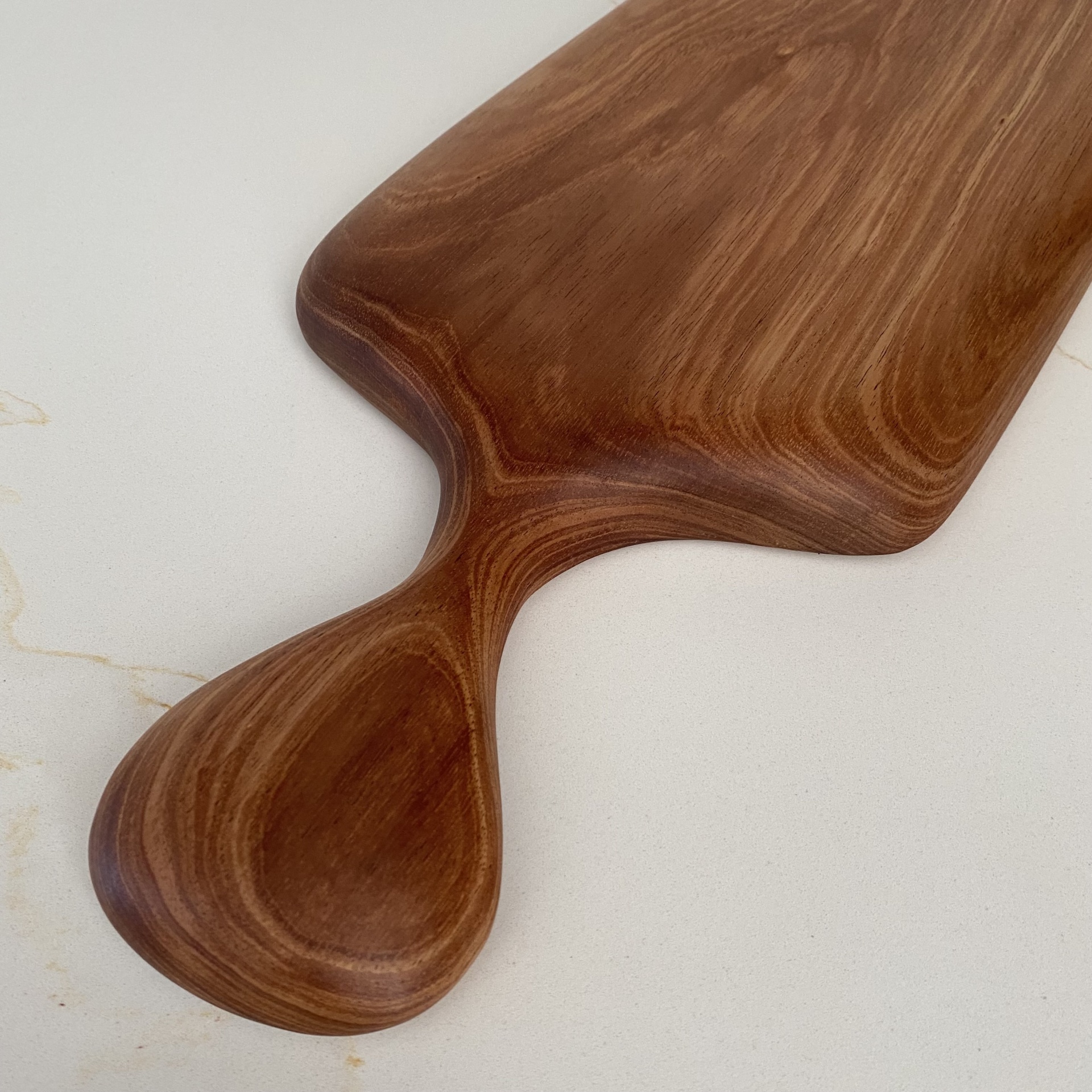 • Tabua de cortar em madeira castanha com pega arredondada sobre superfície branca