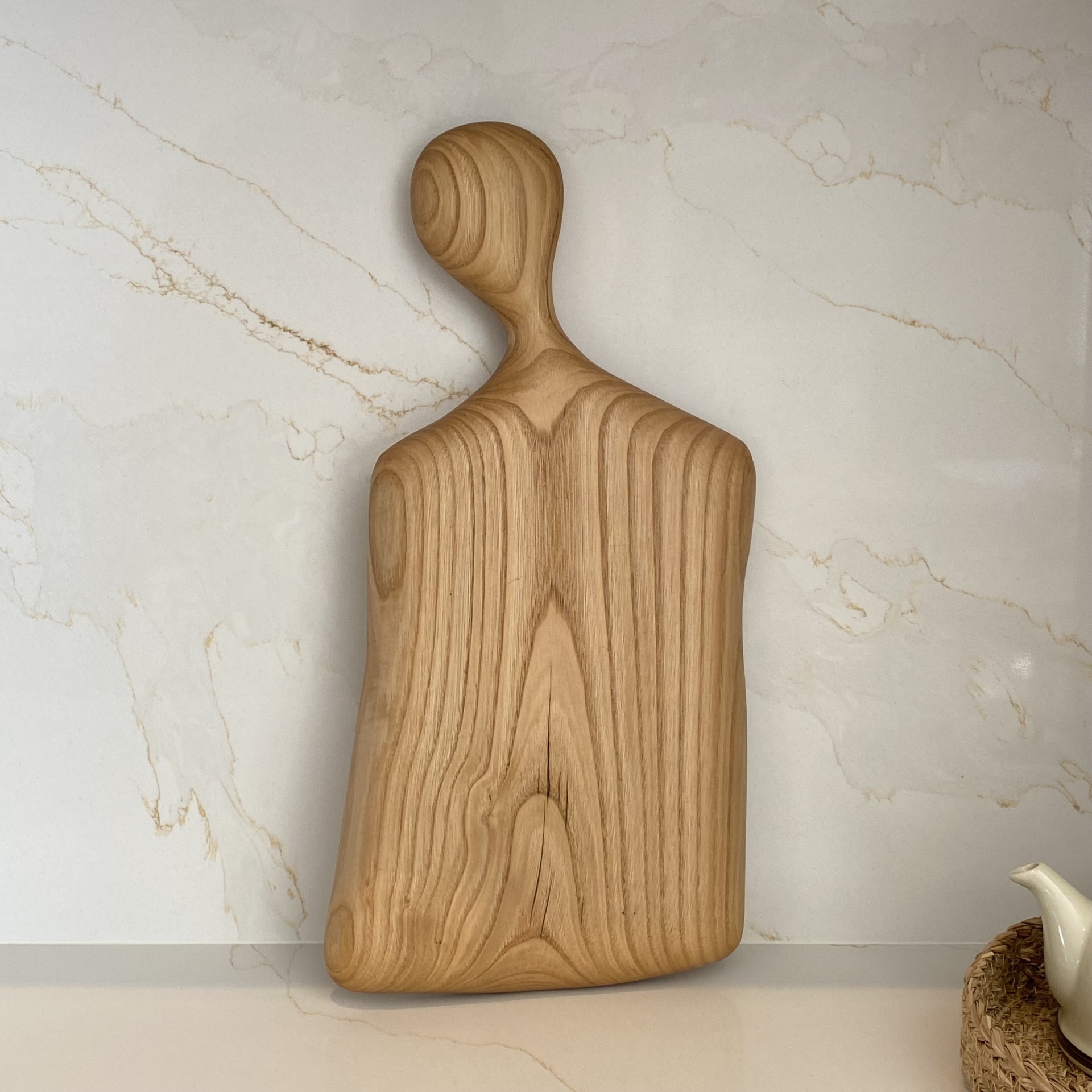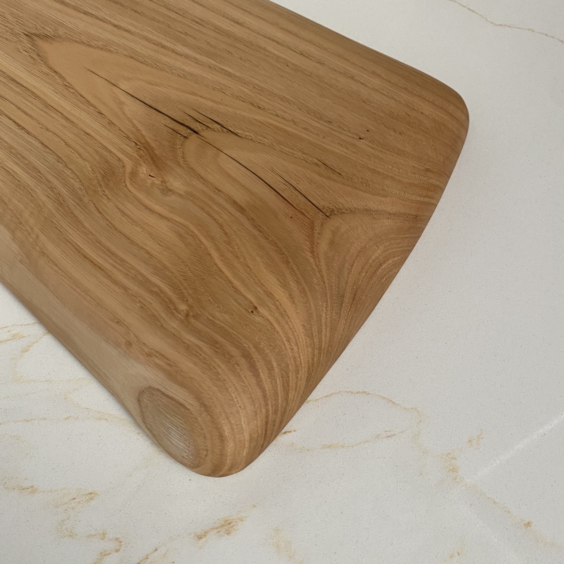 • Tabuleiro de madeira com pega arredondada, veios naturais, sobre superfície branca com riscos creme