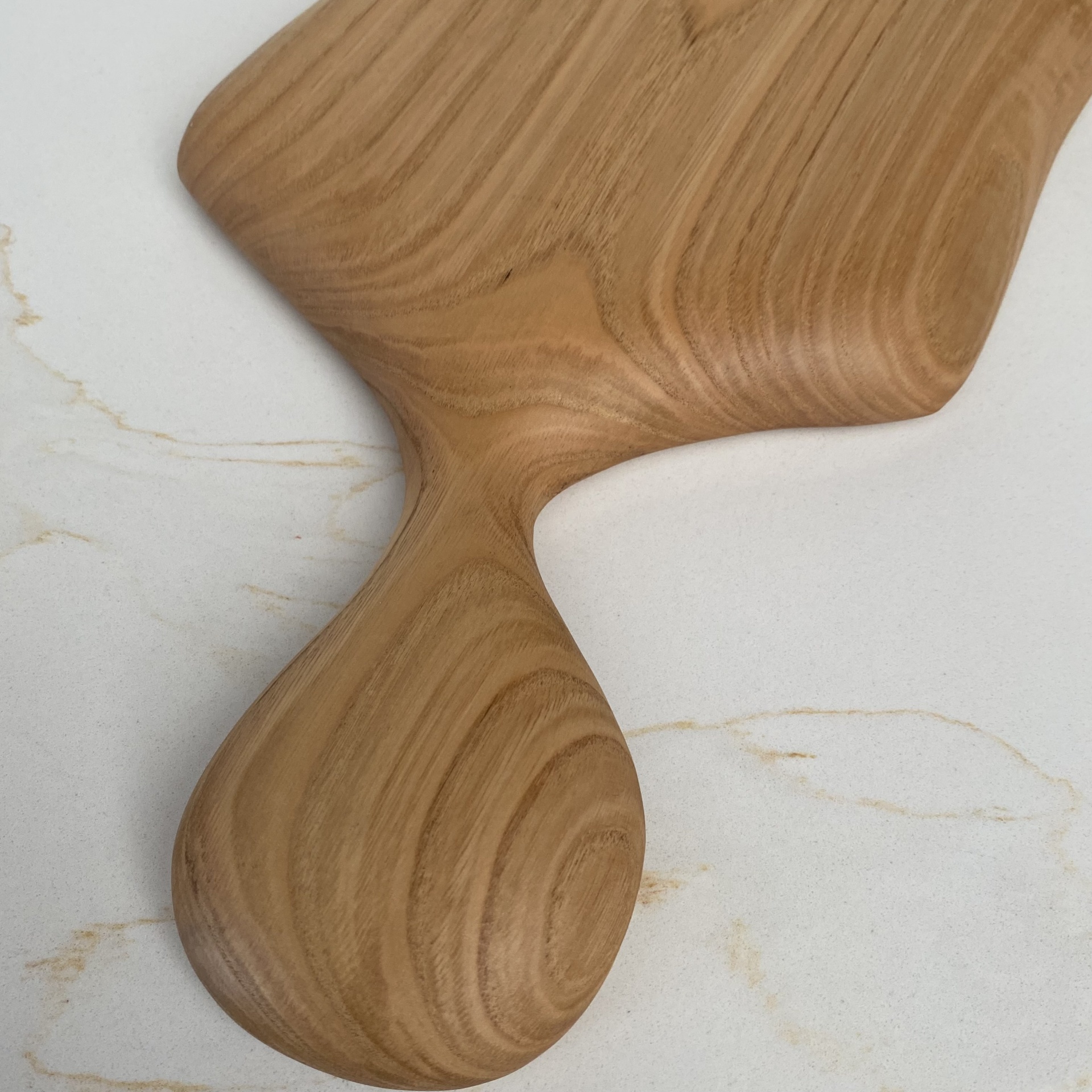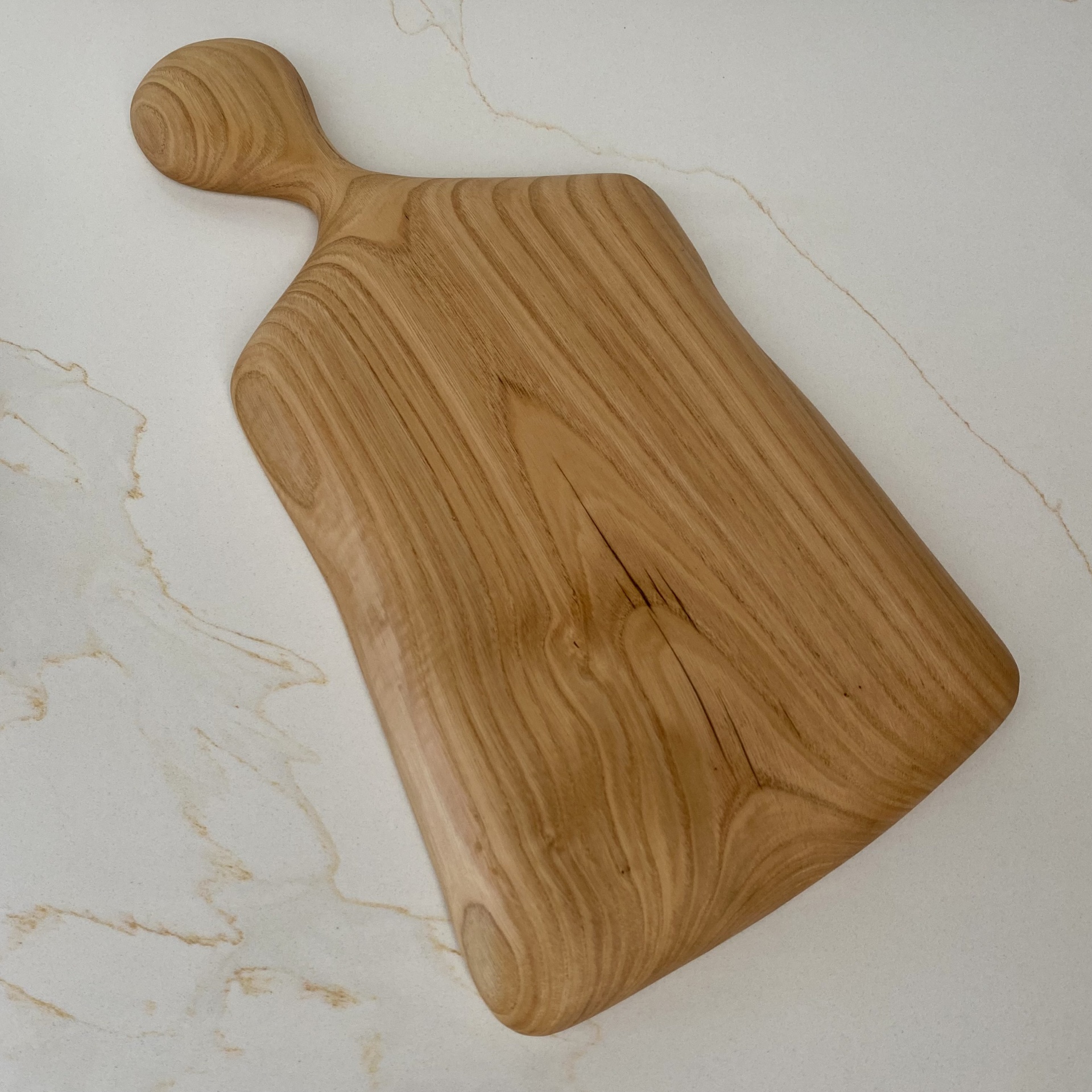 Tábua de cortar de madeira com cabo arredondado sobre uma superfície branca marmoreada