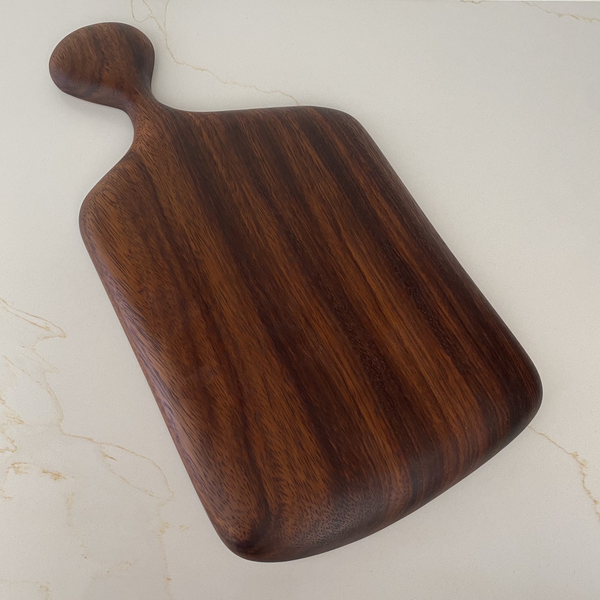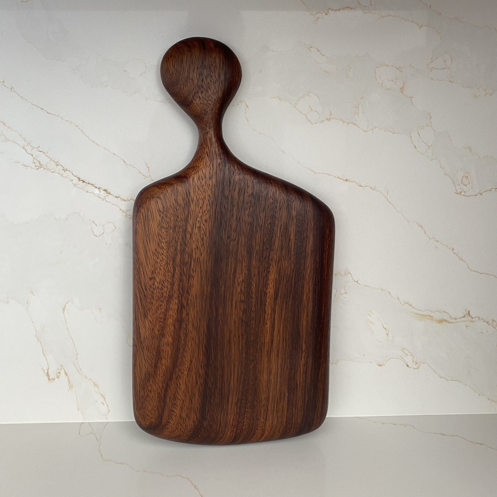 • Tabua de corte em madeira escura com cabo arredondado sobre superfície branca