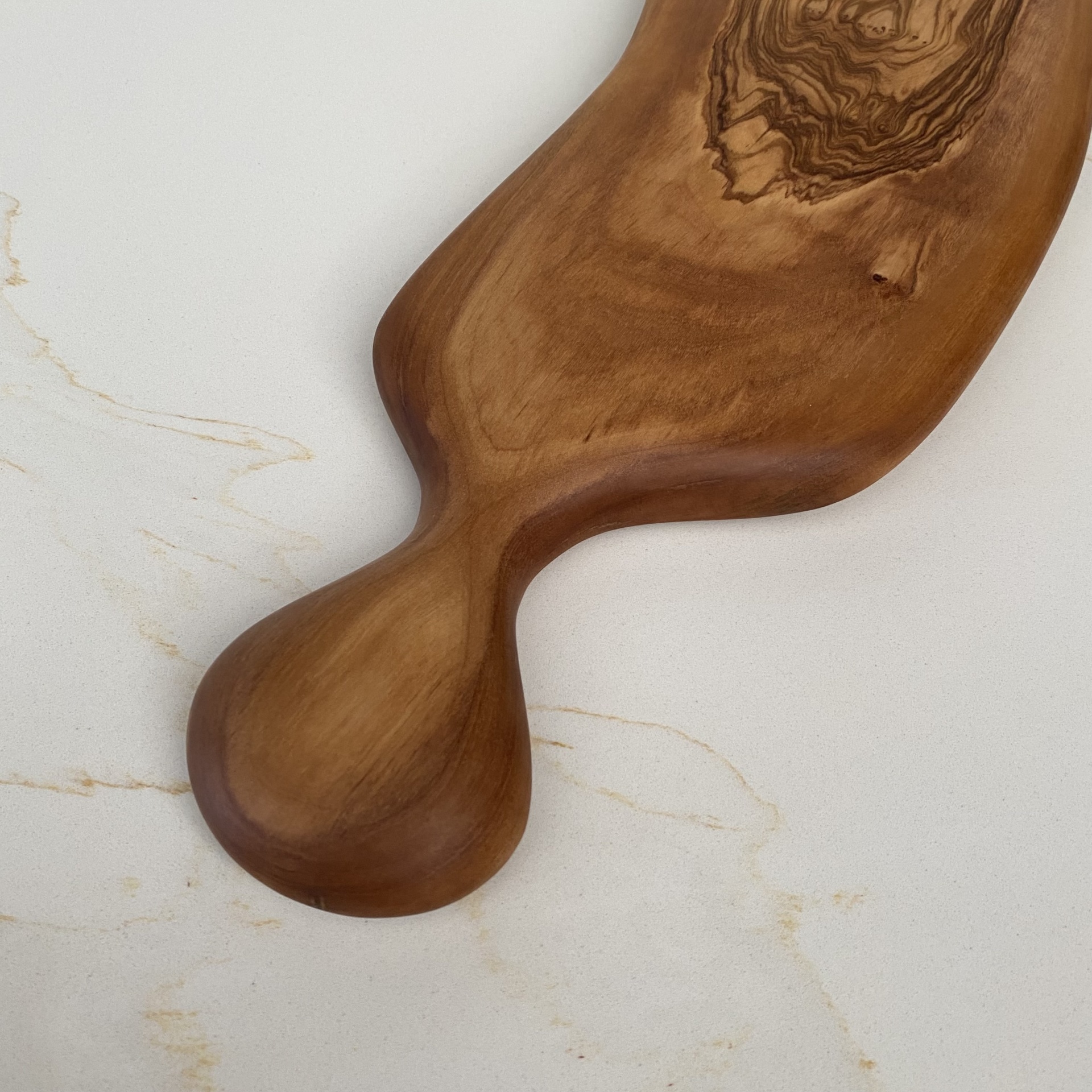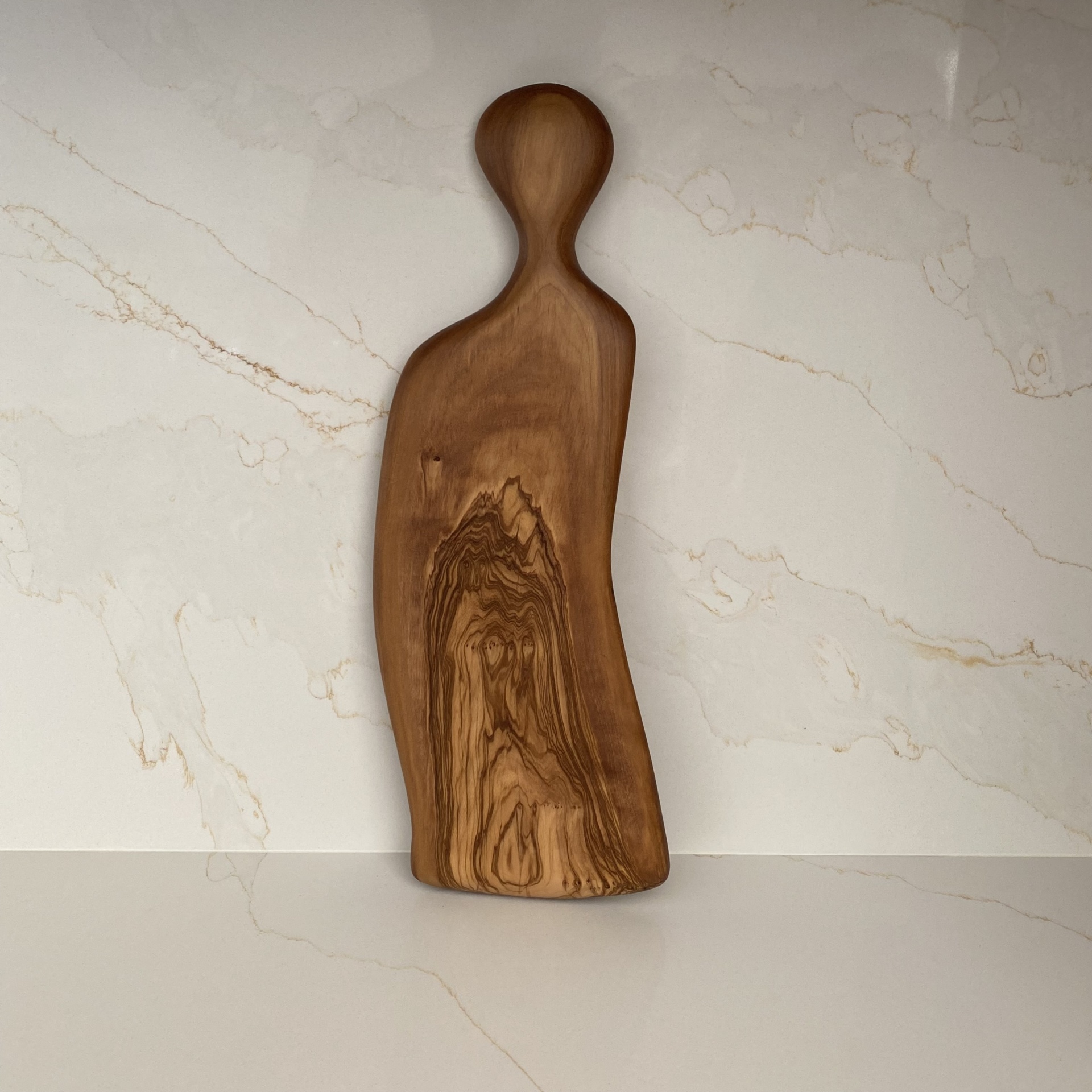 • Tábua de madeira natural com alça redonda contra parede de mármore branco.