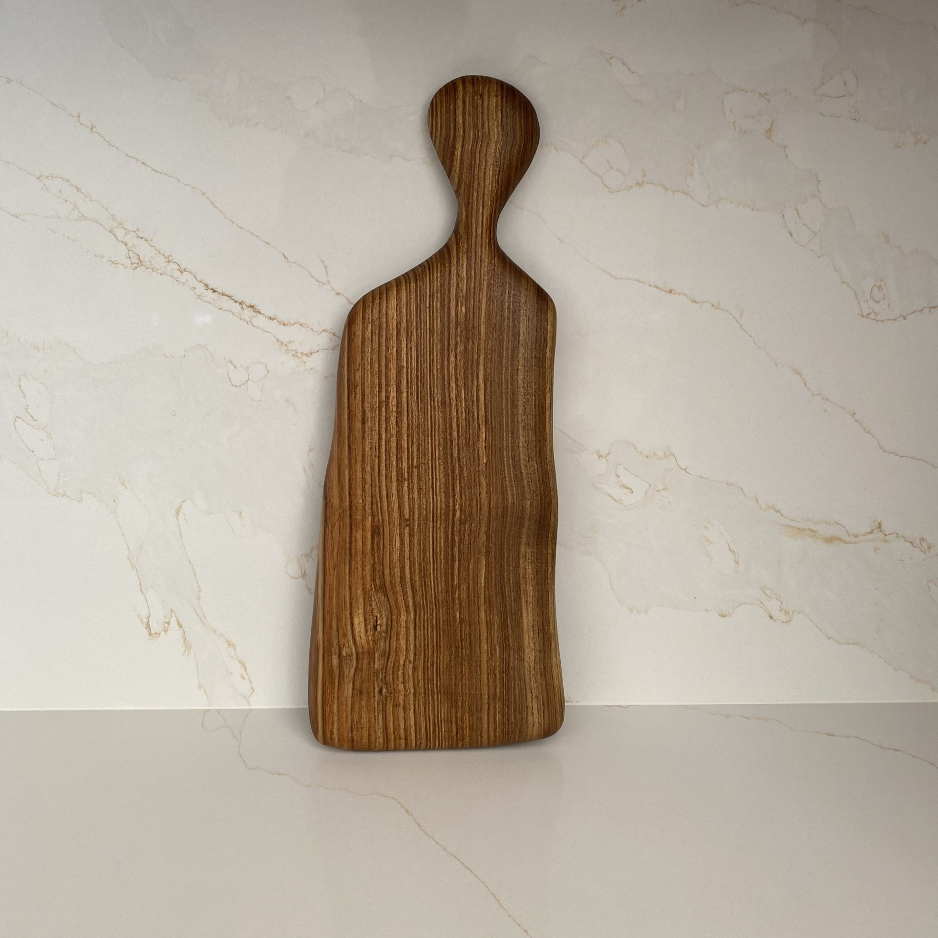 Tábua de cortar em madeira castanha com pega arredondada sobre superfície branca